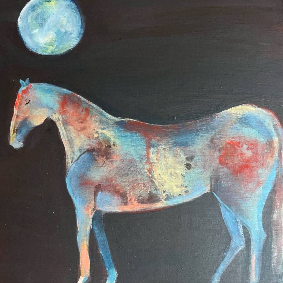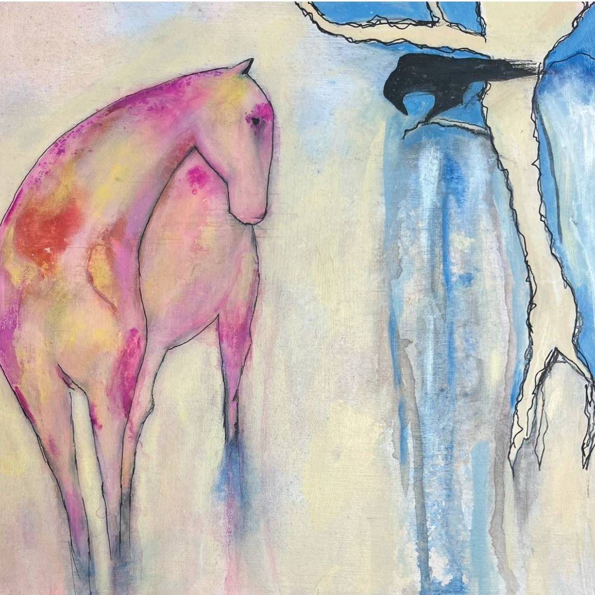Horse and crow 12x12” on wood panel - 250.00